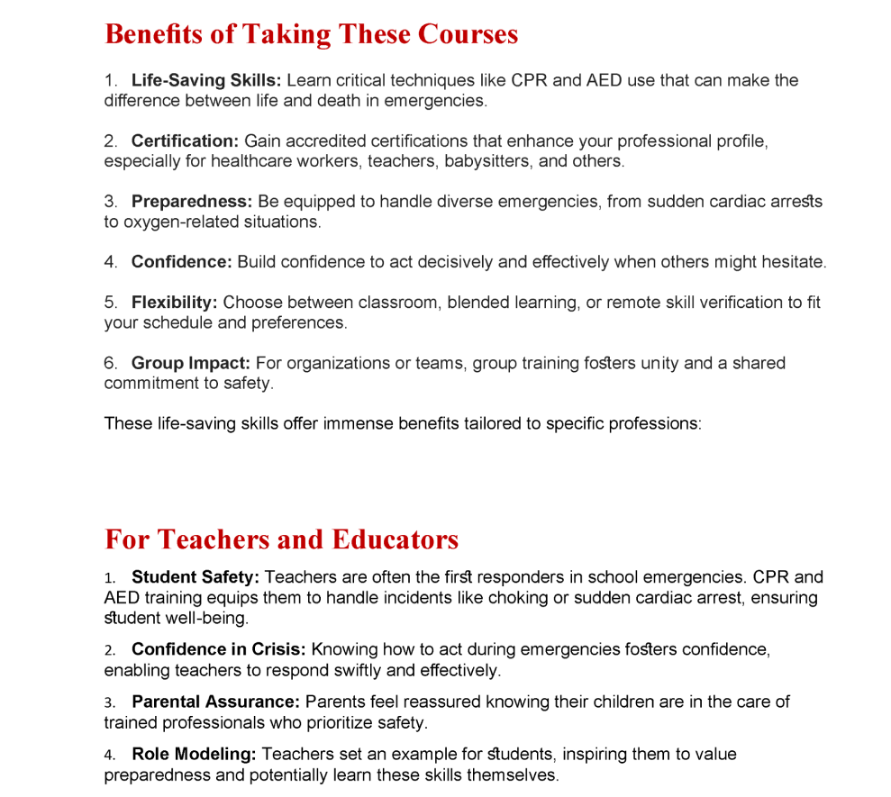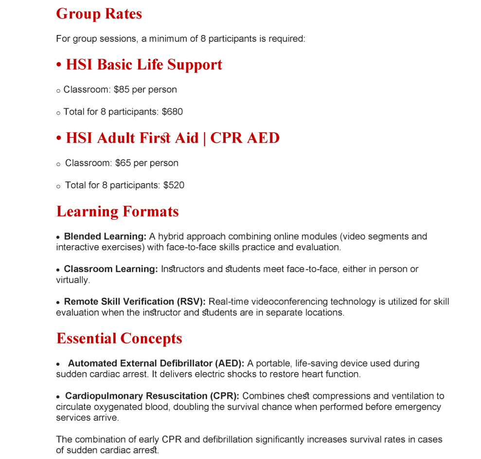 We offer flexible in-person, blended, and group sessions, ideal for schools, workplaces, churches, and community groups. Certification is through the Health & Safety Institute and meets OSHA and workplace standards.